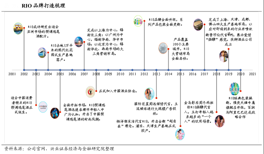 經(jīng)典案例:根據(jù)公司官網(wǎng)、興業(yè)證券經(jīng)濟(jì)與金融研究院等綜合資訊表明,百潤在RTD 市場市占率高達(dá)86%,RTD 第一品牌形象已深入人心。RTD 最早于 20 世紀(jì) 80 年代出現(xiàn)在歐洲,20 世紀(jì) 90 年代國內(nèi) RTD 進(jìn)入啟蒙階段,2003 年 符合中國消費(fèi)者偏好的 RIO 預(yù)調(diào)酒正式誕生。歷經(jīng) 20 年的探索與發(fā)展,百潤旗下 RIO 預(yù)調(diào)酒品牌價值持續(xù)提升,并先后榮獲國家馳名商標(biāo)、上海市著名商標(biāo)、長三角名優(yōu)食品、上海市名牌產(chǎn)品、上海名優(yōu)食品等榮譽(yù)。