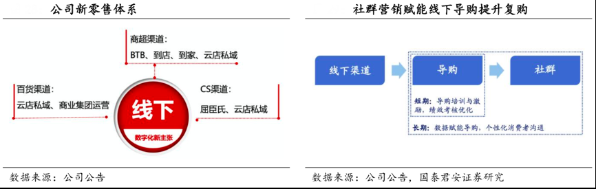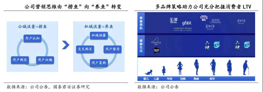 經(jīng)典案例:根據(jù)公司公告、國泰君安證券研究等綜合資訊表明,2021年,上海家化公司將以消費者為中心搭建一站式私域生態(tài),從招募、留存、復購到交叉購買環(huán)節(jié)牢牢把握消費者 LTV:1)私域招募,線上線下多觸點招募用戶進入私域陣地;2)用戶留存,將各私域平臺數(shù)據(jù)整合進公司消費者數(shù)據(jù)中臺,通過建模、標簽化激活數(shù)據(jù)資產(chǎn),為消費者提供個性化推薦和購買福利;3)用戶復購,在千余個線下專柜推行社群營銷,通過專業(yè)導購實現(xiàn)消費者溝通與場景激活;4)跨品牌交叉購買,發(fā)揮公司品牌矩陣橫跨三大品類而互不競爭的優(yōu)勢,通過數(shù)據(jù)中臺分析各品牌消費者共性,以精準營銷促進用戶跨品牌購買,從而降低單品牌獲客成本、提升單用戶 LTV。