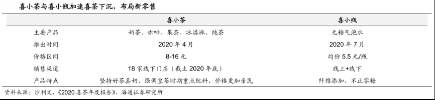 經(jīng)典案例:根據(jù)沙利文、《2020喜茶年度報(bào)告》、海通證券研究所等綜合資訊表明,喜茶 2020 年 7 月推 出喜小瓶,以更多“瓶裝靈感”提供“纖維添加,不止零糖”的無糖氣泡水產(chǎn)品。2020 年,喜茶天貓旗艦店共賣出喜小瓶氣泡水約 140 萬瓶,京東自營旗艦店共售出 50 萬瓶, 天貓雙十一期間,喜小瓶氣泡水類銷量超 4 萬箱 50 萬瓶,位列網(wǎng)紅氣泡水 TOP3。