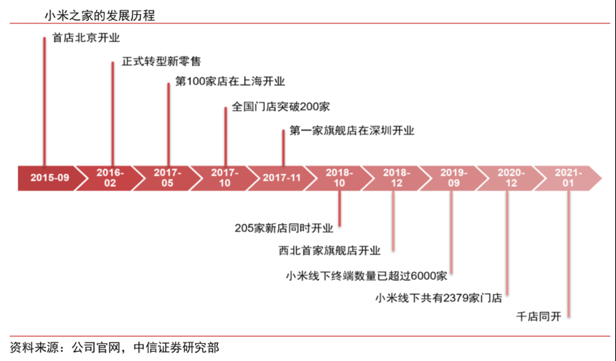 經(jīng)典案例:根據(jù)公司官網(wǎng)、中信證券研究部等綜合資訊表明,最初的小米之家,主要定位為售后服務(wù)、配件銷售和粉絲聚會(huì),2015年北京當(dāng)代商城首家線下銷售、體驗(yàn)的小米之家開業(yè),小米公司開始探索發(fā)展線下門店,提升用戶體驗(yàn)和品牌形象。2016 年,小米公司正式轉(zhuǎn)型線上線下融合的新零售,加速在全國大中城市開店,2017年門店數(shù)量突破 200 家,截至 2020 年 12 年,公司線下門店達(dá)到 2379 家,在 2021 年 1 月 9 日實(shí)現(xiàn)“千 店同開”,公司新零售模式進(jìn)入規(guī)模化拓展和向低線城市下沉的新階段。