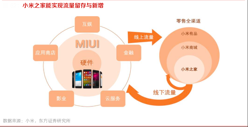 經(jīng)典案例:根據(jù)小米、東方證券研究部等綜合資訊表明,在傳統(tǒng)電商流量紅利逐漸消失的背景下,小米發(fā)展多層次線下渠道,實(shí)現(xiàn)流量留存與新增,線下向 線上反哺,實(shí)現(xiàn)對電商業(yè)務(wù)的導(dǎo)流,如引導(dǎo)小米之家的線下消費(fèi)者安裝米家 APP 和小米有品APP,進(jìn)一步轉(zhuǎn)變?yōu)樾∶兹老M(fèi)者。