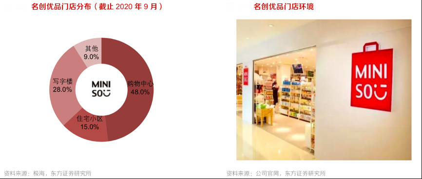 經(jīng)典案例:根據(jù)極海、公司官網(wǎng)、東方證券研究所等綜合資訊表明,截止 2020 年 9 月末,名創(chuàng)優(yōu)品公司近50%的門店選址高流量的購物中心,其建立了一系列的標準制度指導門店裝修和商品陳設(shè),具有三大特征: 白色基調(diào)、空間開闊和太空箱。其在貨架高度、貨品陳列方面也進行詳細研究,打造令顧客滿意 的購物環(huán)境;店內(nèi)不設(shè)導購,給予消費者充分的挑選空間。根據(jù)名創(chuàng)優(yōu)品公司披露的數(shù)據(jù),消費者對商品、服務和門店環(huán)境的好評率均在90%左右。