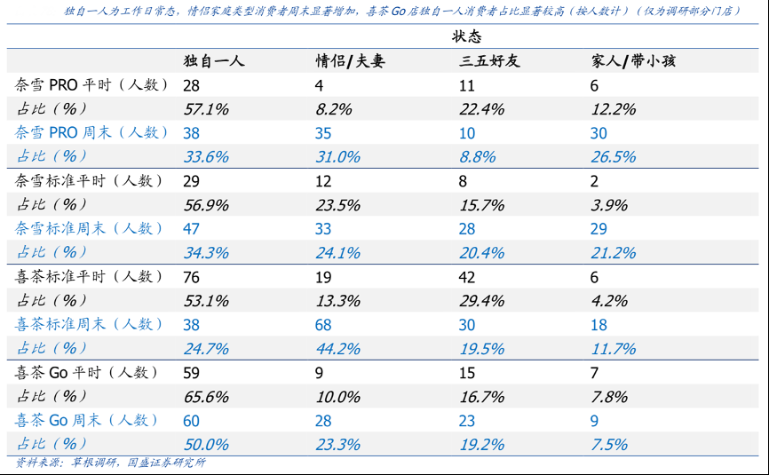 經(jīng)典案例:根據(jù)草根調(diào)研、國盛證券研究所等綜合資訊表明,社交空間和溫馨氛圍吸引差異化用戶群體,根據(jù)門店調(diào)研,30-40歲家庭消費(fèi)為奈雪重要消費(fèi)群體。其消費(fèi)特征突出:1)年齡:喜茶的用戶年齡群體明顯更加年輕,喜茶標(biāo)準(zhǔn)店與 Go 店 20-30 歲消費(fèi)群體占比都在六成以上;對比之下,奈雪的用戶 30-40 歲成為主流消費(fèi)群體,占比在達(dá)到五成左右。2)消費(fèi)群體:奈雪店鋪消費(fèi)群體中。一家人、帶小孩類的消費(fèi)群體占比在周末顯著高于喜茶。