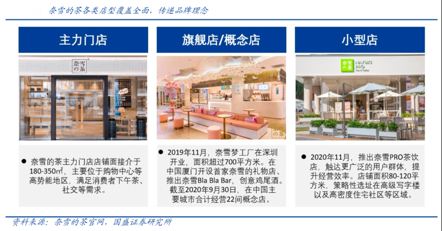 經(jīng)典案例:根據(jù)奈雪的茶官網(wǎng)、國(guó)泰證券研究所等綜合資訊表明,奈雪的茶門(mén)店多層次布局,滿(mǎn)足消費(fèi)者多元化需求。 奈雪的茶標(biāo)準(zhǔn)店:茶飲主力門(mén)店店鋪主要位于購(gòu)物中心等高勢(shì)能地區(qū),為奈雪的傳統(tǒng)門(mén)店。奈雪旗艦店:包括奈雪夢(mèng)工廠(chǎng)、奈雪的禮物店以及奈雪Bla Bla Bar,向消費(fèi)者傳遞多元化體驗(yàn)。奈雪于 2020 年 11 月推出奈雪PRO 門(mén)店,其店鋪面積介于 80-120 平方米,選址在高級(jí)寫(xiě)字樓即高密度住宅等區(qū)域。