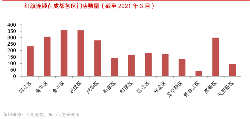 經(jīng)典案例:根據(jù)公司官網(wǎng)、東方證券研究所等綜合資訊表明,紅旗連鎖公司門店主要其中于成都市,其中92.3%都集中于成都市,7.7%分布于其他縣市。其公司在大成都范圍及周邊市區(qū)形成了網(wǎng)絡(luò)布局優(yōu)勢,同時其門店通常選址于所在城市的黃金地段或預(yù)計具有良好發(fā)展?jié)摿Φ纳倘Α?