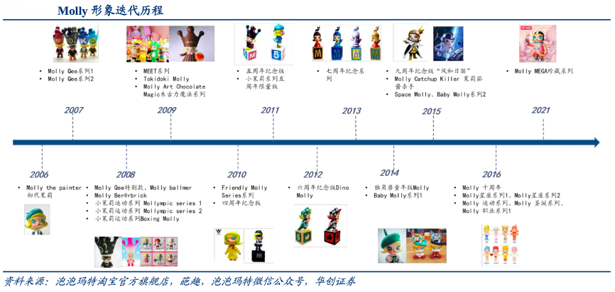 經(jīng)典案例:根據(jù)泡泡瑪特淘寶官方旗艦店、葩趣、泡泡瑪特微信公眾號、華創(chuàng)證券等綜合資訊表明,大多數(shù)消費(fèi)者接觸泡泡瑪特多源于旗下盲盒 Molly 形象,外觀為可愛治愈的萌娃設(shè)計方案,該形象由王信明先生于 2006 年首次創(chuàng)作,2016 年泡泡瑪特買斷 Molly 版權(quán)開啟 IP 運(yùn)營。藝術(shù)家專注于藝術(shù)創(chuàng)作下,此后迭代頻率由每年 1-2 個系列提升至包含衍生品和集卡、徽章等周邊在內(nèi)的幾十個系列,顯著提升消費(fèi)者與 IP 之間的情感紐帶以提升消費(fèi)忠誠度和復(fù)購率。