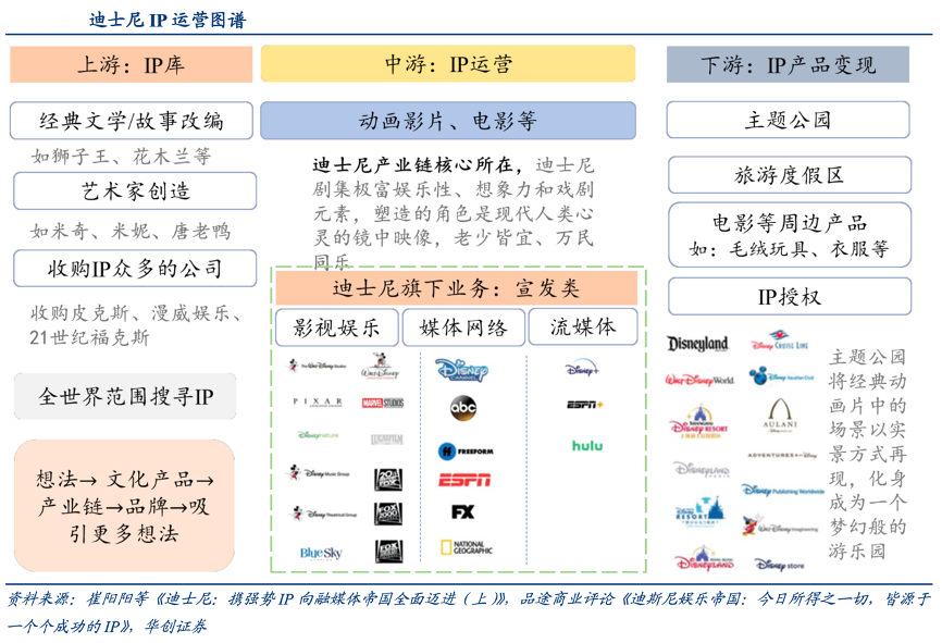 經(jīng)典案例:根據(jù)《迪士尼:攜強(qiáng)勢IP向融媒體帝國全面邁進(jìn)(上)》、品途商業(yè)評論、華創(chuàng)證券等綜合資訊表明,迪士尼商業(yè)模式橫跨傳媒至消費(fèi)品,業(yè)績持續(xù) 穩(wěn)增的秘密在于多輪次重復(fù)變現(xiàn)帶來的乘數(shù)效應(yīng),而核心驅(qū)動力則源于優(yōu)質(zhì) IP 池。以由名作《哈密雷特》改編的動畫影片《獅子王》為例,迪士尼強(qiáng)調(diào)畫面沖擊感和高立意娛樂性,受眾可覆蓋各年齡圈層,即從廣宣層面獲客;媒介層面則憑借全渠道優(yōu)勢觸達(dá)用戶, 將影視作品以實景沉浸式呈現(xiàn),將消費(fèi)者迭代為“粉絲”,增強(qiáng)受眾粘性和 IP 影響力,以周邊潮玩等相對低客單價產(chǎn)品吸引“潛在忠實粉絲”,使客戶從情感認(rèn)同轉(zhuǎn)化為文化認(rèn)同,將印有迪士尼標(biāo)簽的價值觀輸出至消費(fèi)者。