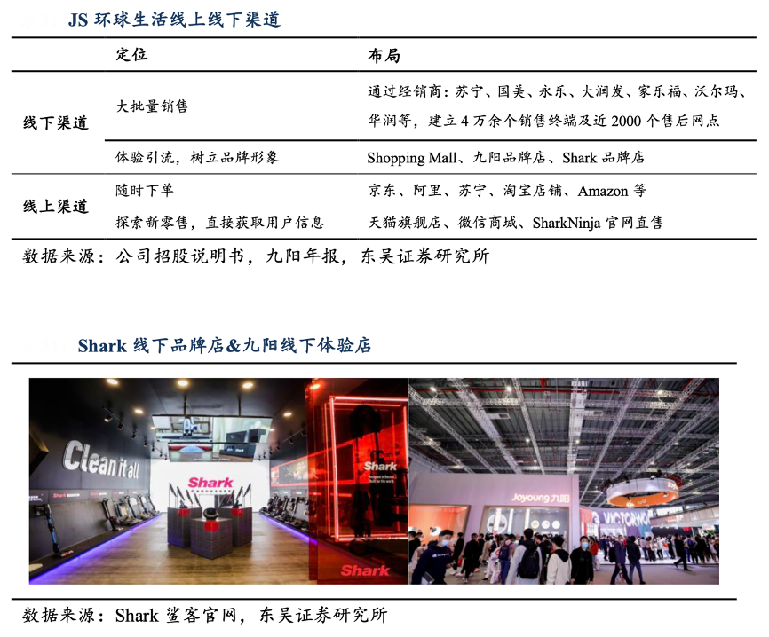 經(jīng)典案例:根據(jù)公司招股說明書、九陽年報(bào)、Shark鯊客官網(wǎng)、東吳證券研究所等綜合資訊表明,九陽公司品牌店一般于高端商場(chǎng)運(yùn)營(yíng),其多年共建立 700 多家九陽品牌店,累積了大量合作伙伴幫助 Shark 也拓展了 201 個(gè)線下品牌 店,給予消費(fèi)者體驗(yàn)產(chǎn)品的機(jī)會(huì),打造品牌形象。