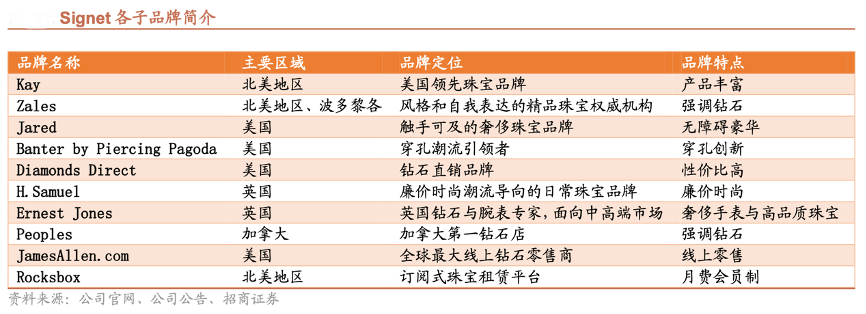 經(jīng)典案例:根據(jù)公司官網(wǎng)、公司公告、招商證券等綜合咨詢(xún)表明,Signet 自2018 年提出新戰(zhàn)略以來(lái),更加注重各大子品牌的差異化,加強(qiáng)核心品牌建設(shè)。美國(guó)市場(chǎng)上,Kay是品類(lèi)豐富的提供各類(lèi)場(chǎng)合珠寶的百年老號(hào);Zales強(qiáng)調(diào)時(shí)尚導(dǎo)向和自我表達(dá);而加拿大的 Peoples 強(qiáng)調(diào)鉆石業(yè)務(wù),被稱(chēng)為“加拿大第一鉆石店”。