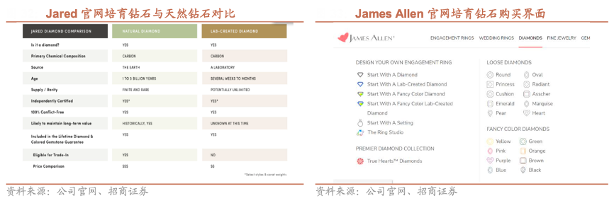 經(jīng)典案例:根據(jù)公司官網(wǎng)、招商證券等綜合咨詢(xún)表明,2019 年 Signet 宣布開(kāi)始銷(xiāo)售培育鉆石珠寶首飾,培育鉆石不僅限于時(shí)尚珠寶,還擴(kuò)大到婚慶珠寶范 圍,除了成品珠寶,Jared 還在銷(xiāo)售培育鉆石裸石和戒托用于私人定制。Jared 線上網(wǎng)站更是開(kāi)出培育鉆石產(chǎn)品選購(gòu)專(zhuān)區(qū),Piercing Pagoda 有 9 款產(chǎn)品,James Allen 主要銷(xiāo)售產(chǎn)品即為培育鉆石產(chǎn)品。