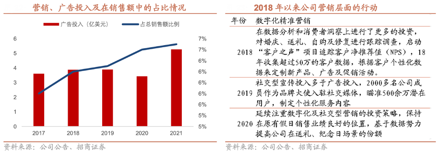 經(jīng)典案例:根據(jù)公司公告、招商證券等綜合咨詢表明,自“Path to Brilliance”戰(zhàn)略實(shí) 施以來(lái),Signet公司加大營(yíng)銷投入,營(yíng)銷廣告投入占銷售額的比例均大于 6%。不斷提升公司數(shù)字化效率。同時(shí)其公司服務(wù)包含有珠寶更換計(jì)劃、永久性護(hù)理及修復(fù)服務(wù)、穿刺服務(wù)、完備的信貸金融服務(wù)、高定服務(wù)以及高端珠寶的禮賓服務(wù)等。
