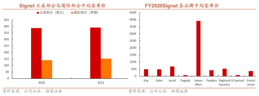 經(jīng)典案例:根據(jù)公司公告、招商證券等綜合咨詢表明,Signet 大部分子品牌平均客單價(jià)在 1000 美元以下,定價(jià)較低以吸引更多的顧客,偏向“薄利多銷”。2021 財(cái)年,Signet 北美部分的客單價(jià)為 392 美元,國(guó)際部分的為 153 英鎊。Tiffany 產(chǎn)品單價(jià)在 3100-30 萬(wàn)美元之間不等。相較于 Tiffany, Signet 客單價(jià)相對(duì)較低且每年的變化較小。