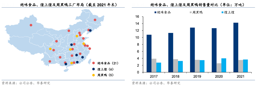 經(jīng)典案例:根據(jù)公司公告、華泰研究等綜合資訊表明,2021年絕味銷售量達(dá) 14.2 萬噸,遠(yuǎn)高于煌上煌/周黑鴨的3.7/3.5 萬噸。銷售規(guī)模優(yōu)勢(shì)下其已形成全國化 工廠及終端門店先發(fā)布局優(yōu)勢(shì)。生產(chǎn)端,至 21 年末其已在全國范圍內(nèi)建立了 21 個(gè)生產(chǎn)基地(2 家在建),同期煌上煌/周黑鴨工廠數(shù)為6/5個(gè);銷售端,絕味食品2021年年報(bào)顯示,至2021年末,其門店數(shù)達(dá) 13714 家,已覆蓋至國內(nèi) 31 個(gè)省級(jí)行政區(qū)域,且在各省級(jí)區(qū)域均具備一定市場(chǎng)影響力。