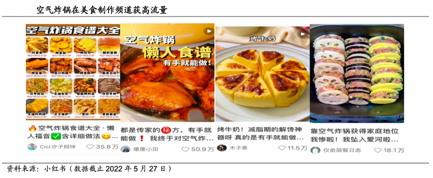經(jīng)典案例:根據(jù)小紅書、國海證券研究所等綜合資訊表明,從內(nèi)容平臺上看,空氣炸鍋相關(guān)推文關(guān)注度高,小紅書平臺熱門筆記發(fā)布 4 個月內(nèi),單篇點贊量高達 51 萬。從博主類型上看,多為美食類 KOL 分享食物制作,少有好物分享類 KOL 推薦特定品牌,市場存在較大挖掘空間。