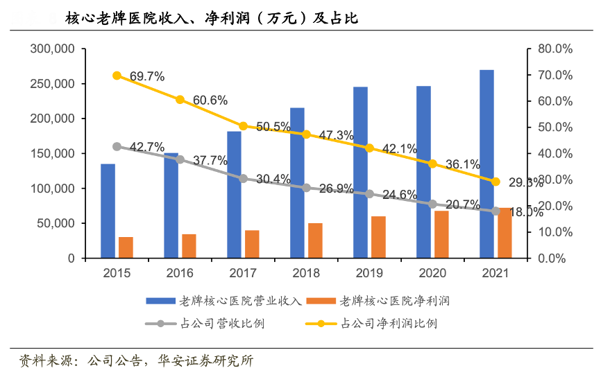 經(jīng)典案例:根據(jù)公司公告、華安證券研究所等綜合資訊表明,2015 年至 2021 年,愛(ài)爾眼科核心老牌醫(yī)院收入占比由 69.7%減少到 29.3%,凈利潤(rùn)占比由 42.7%減少到 18.0%,說(shuō)明公司標(biāo)準(zhǔn)化復(fù)制取得顯著成效,眾多新增醫(yī)院進(jìn)入快速增長(zhǎng)階段,其逐步成為集團(tuán)醫(yī)院體系的新一代支柱,支持公司未來(lái)持續(xù)擴(kuò)張的戰(zhàn)略,公司品牌影響力也有望不斷擴(kuò)大,形成良性循環(huán)與增長(zhǎng)飛輪。