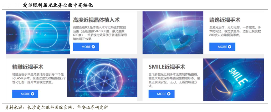 經(jīng)典案例:根據(jù)長(zhǎng)沙愛(ài)爾眼科醫(yī)院官網(wǎng)、華安證券研究所等綜合資訊表明,愛(ài)爾眼科屈光業(yè)務(wù)全面中高端化,增速亮眼。2021年,公司屈光收入中,全飛 秒手術(shù)占比 45~50%,半飛秒占比 25~30%,ICL 占比20~25%,其他低端手術(shù)占比不到5%,其中公司近幾年推出的精雕(高端個(gè)性化半飛秒手術(shù))是所有手術(shù)中增速最快的。