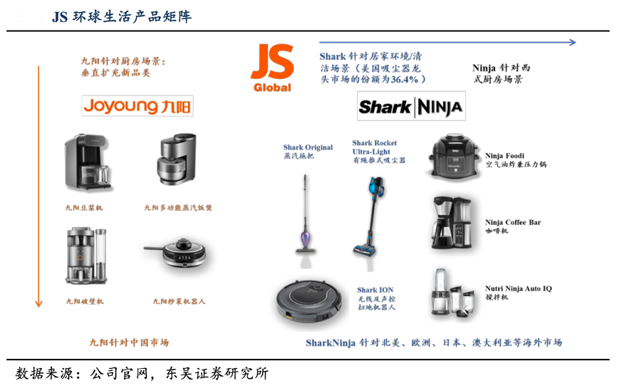經(jīng)典案例:根據(jù)公司官網(wǎng)、東吳證券研究所等綜合資訊表明,九陽公司在產(chǎn)品拓展分為縱向和橫向擴展兩個方向??v向是九陽引導(dǎo)的廚房小家電場景的垂直拓展,在豆?jié){機后不斷開拓新品類成為公司新的增長引擎;橫向指通過收購 SharkNinja 開拓出居家環(huán)境場景和西式廚電場景。其集團整體的產(chǎn)品矩陣得以完善,在實現(xiàn)多品牌運營的同時,走上小家電出海之路。