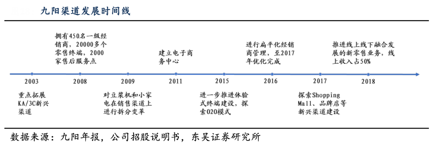 經(jīng)典案例:根據(jù)公司官網(wǎng)、公司招股說明書、東吳證券研究所等綜合資訊表明,九陽公司早在 2011 年成立電子商務(wù)中心,2018年時九陽已經(jīng)打造了線上直銷系統(tǒng)(包括天貓旗艦店,以及微信“九陽商城”),并且分銷網(wǎng)絡(luò)覆蓋了幾乎所有主要的電商平臺(包括三大電商平臺淘寶,京東和蘇寧易購)。截止 2018 年中三大電商平臺的日均流量達到了 110 萬人次并合計擁有訂閱人次超 1510 萬用戶。