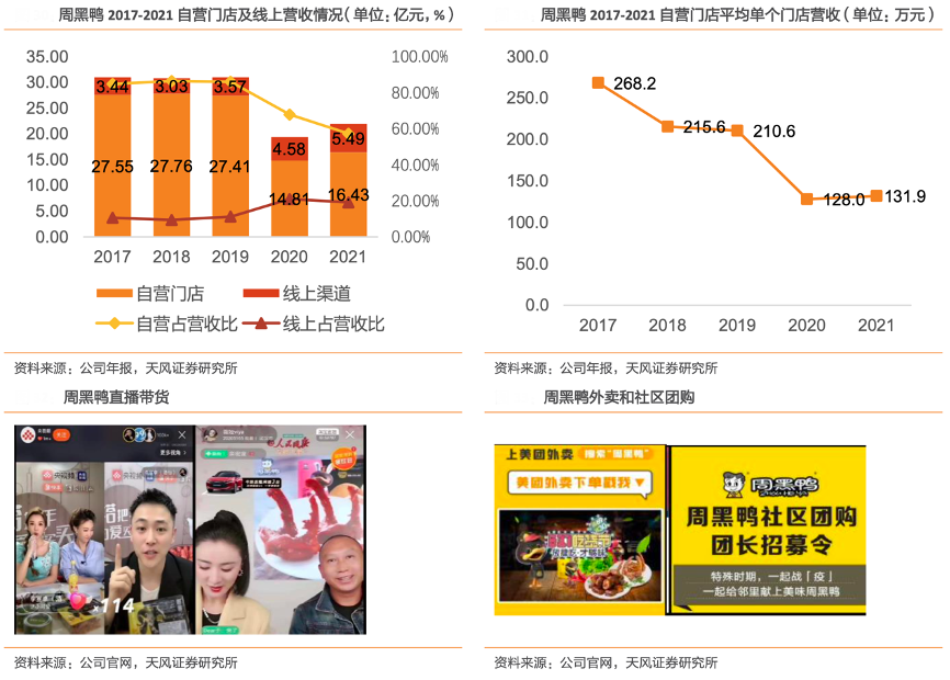 經(jīng)典案例:根據(jù)公司年報(bào)、公司官網(wǎng)、天風(fēng)證券研究所等綜合資訊表明,周黑鴨分銷(xiāo)售渠道來(lái)看,公司自營(yíng)門(mén)店始終為主要銷(xiāo)售收入來(lái)源,2017-2021 年占比均超過(guò) 55%。其中,2020 與 2021 年 占比從 2019 年的 86%降至68%及 57%,出現(xiàn)明顯下降趨勢(shì)。同時(shí)受疫情影響,消費(fèi)場(chǎng)景逐漸向線(xiàn)上轉(zhuǎn)移,公司緊跟這一變化,通過(guò)渠道拓展、產(chǎn)品研發(fā)和數(shù)字化賦能等策略在線(xiàn)上電商業(yè)務(wù)方面取得顯著成效,同時(shí)通過(guò)外賣(mài)和社區(qū)團(tuán)購(gòu)齊發(fā)力,順利提升公司線(xiàn)上營(yíng)收及占比。