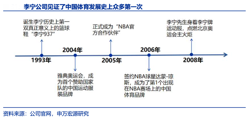 經典案例:根據(jù)公司官網(wǎng)、申萬宏源研究等綜合資訊表明,1992年巴塞羅那 奧運會,李寧牌被選為中國體育代表團專用領獎裝備,終結了中國運動員在奧運會上使用外國品牌的歷史。1993年,在國內將籃球鞋、跑鞋等統(tǒng)稱為旅游鞋,未出現(xiàn)細化分類時,李寧便推出中國歷史上第一雙真正意義上的籃球鞋,取名李寧 937。2004年雅典奧運會,李寧成為首個贊助國家隊的中國運動品牌,2016 年成為首個出現(xiàn)在 NBA 賽場上的中國體育品牌。