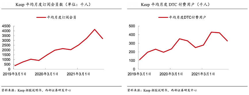 經(jīng)典案例:根據(jù)Keep招股說明書、西部證券研發(fā)中心等綜合資訊表明,由于健身內(nèi)容的擴(kuò)展,直播課的引入以及運動產(chǎn)品的多元化,Keep付費用戶群在不斷增加,平均月度訂閱會員數(shù)量從 2019 年的 80 萬人增加到 2021 年的 330 萬人;平均月度 DTC 付費 用戶 2019 年為 18.4 萬人,2020年增長至 29.2 萬人,2021 年進(jìn)一步提升至 36.5 萬人。付費用戶的次月留存率為 67%,意味著有三分之二的用戶會在首月付費后,第二個月繼續(xù)選擇付費。