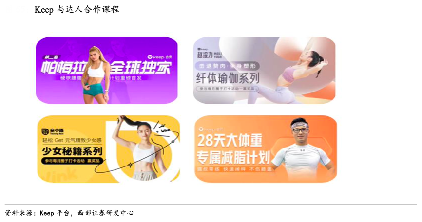 經(jīng)典案例:根據(jù)Keep平臺、西部證券研發(fā)中心等綜合資訊表明,Keep將提供運營分析,幫助達人更好地了解粉絲的喜好,并提供與平臺合作制作優(yōu)質(zhì)內(nèi)容的機會。對于高人氣和富有創(chuàng)意的達人,Keep 會將他們直接介紹給廣告主,以擴大他們的變現(xiàn)機會。截至 2021 年 12 月 31 日,健身達人,健身專業(yè)人士和內(nèi)容提供商有 7600 個健身課程在 Keep 平臺上。