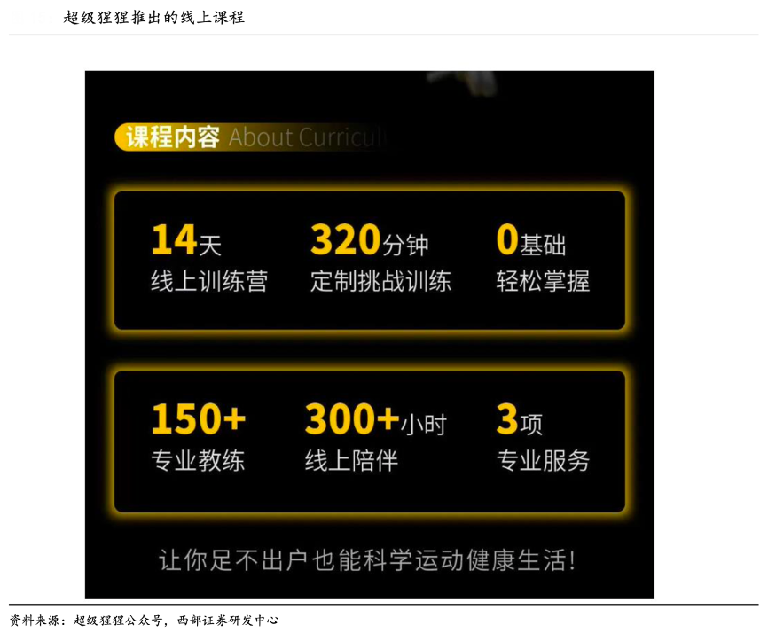 經(jīng)典案例:根據(jù)超級猩猩、西部證券研發(fā)中心等綜合資訊表明,以超級猩猩為例,2020年 1 月 31 日,在抖音推出了第一場直播,在線人數(shù)超過了 17 萬;同年 2 月 10 號,其正式宣布推出 14 天線上「陪」訓營,通過教練組建企業(yè)微信班級群的方式,提供飲食建議和定制訓練計劃的服務。