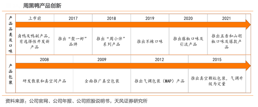 經(jīng)典案例:根據(jù)公司官網(wǎng)、公司年報、公司招股說明書及天風證券研究所等綜合資訊表明,周黑鴨公司以鹵鴨及鴨副產(chǎn)品起家,有選擇性地開發(fā)新產(chǎn)品以迎合消費者需求。2017年,公司進入小龍蝦行業(yè);2018年推出“周小伴”系列氣泡水和啤酒。2020年推出了藤椒系列產(chǎn)品及引流產(chǎn)品—真香鴨排和素菜系列;2021增加五香和山胡椒等新口味以及香辣蝦球、虎皮鳳爪等爆款產(chǎn)品,均 取得不錯反響。