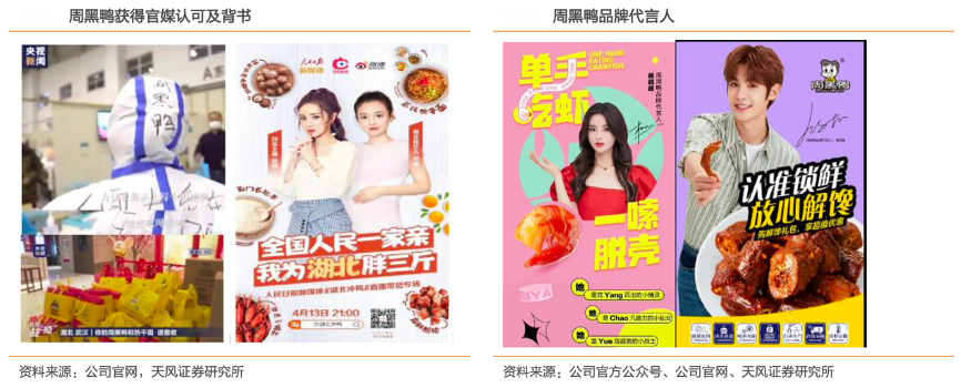 經(jīng)典案例:根據(jù)公司官網(wǎng)、公司官方公眾號、天風證券研究所等綜合資訊表明,周黑鴨針對 90 和 00 后的核心消費群體,與偶像代言人合作,并在高勢能區(qū)域投放廣告來加強品牌的全國性知名度。2020年,其推出全新宣傳語—“沒滋味? 就吃周黑鴨”,以此植入消費者心智,進一步拓展年輕市場。
