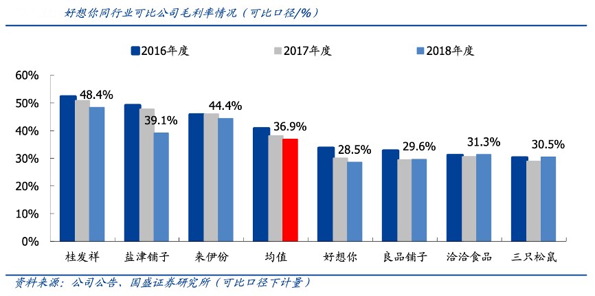 經(jīng)典案例:根據(jù)公司公告、國(guó)盛證券研究所等綜合資訊表明,在休閑食品行業(yè)中,線下為主的品牌毛利率略高,線上為主的品牌毛利率較低。2018年,休閑食品上市公司可比平均毛利率為36.9%,鹽津鋪?zhàn)?、?lái)伊份等毛利率均較高。