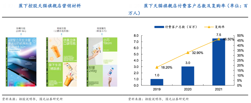 經(jīng)典案例:根據(jù)招股說明書、國元證券研究所等綜合資訊表明,蕉下提供適配熒幕顯示的精美視頻和圖像,為客戶提供沉浸式的戶外氛圍,令客戶在無需線下接觸產(chǎn)品即可清晰認(rèn)知產(chǎn)品,通過 DTC 渠道與客戶建立親密關(guān)系從而提高客戶粘性,公司主要銷售渠道之一的天貓旗艦店付費(fèi)客戶總數(shù)從 2019 年的 100 萬增至 2021 年的 750 萬人,對(duì)應(yīng)復(fù)購率從 2019 年的 18.2% 增至 2021 年的46.5%。