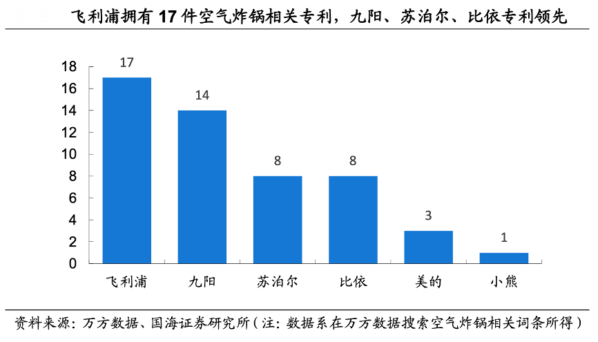 經(jīng)典案例:根據(jù)萬(wàn)方數(shù)據(jù)、國(guó)海證券研究所等綜合資訊表明,頭部品牌擁有多重專利保駕護(hù)航,新入場(chǎng)的比依研發(fā)實(shí)力強(qiáng)勁。從空氣炸鍋發(fā)明專利數(shù)量來看,飛利浦穩(wěn)居龍頭達(dá)到 17 件,九陽(yáng) 14 件發(fā)明專利居國(guó)內(nèi)之首,蘇泊爾、比依各有相關(guān)發(fā)明專利 8 件,處于行業(yè)領(lǐng)先水平。