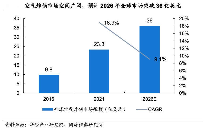 經(jīng)典案例:根據(jù)華經(jīng)產(chǎn)業(yè)研究院、國(guó)海證券研究所等綜合資訊表明,結(jié)合ZION統(tǒng)計(jì)數(shù)據(jù),2021年全球快餐市場(chǎng)規(guī)模約 6477 億美元,2028將達(dá)到 9980 億美元,高基數(shù)下2022-2028 年 CAGR 預(yù)計(jì)4.6%??諝庹ㄥ伵腼兊氖称纺軌驇眍愃瓶觳偷目诟?,具有油炸替代屬性,故大體量傳統(tǒng)快餐市場(chǎng)為空氣炸鍋發(fā)展帶來天然空間。華經(jīng)產(chǎn)業(yè)研究院數(shù)據(jù)顯示,2021年全球空氣炸鍋市場(chǎng)規(guī)模 23.3 億美元,2016-2021年 CAGR18.9%。