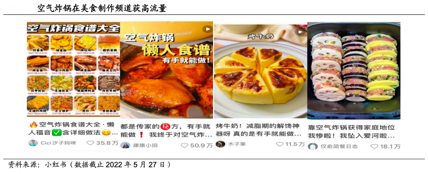 經(jīng)典案例:根據(jù)小紅書、國海證券研究所等綜合資訊表明,從內容平臺上看,空氣炸鍋相關推文關注度高,小紅書平臺熱門筆記發(fā)布 4 個月內,單篇點贊量高達 51 萬。從博主類型上看,多為美食類 KOL 分享食物制作,少有好物分享類 KOL 推薦特定品牌,市場存在較大挖掘空間。
