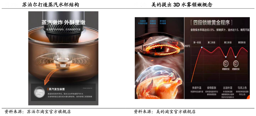 經(jīng)典案例:根據(jù)美的淘寶官方旗艦店、九陽淘寶官方旗艦店、國海證券研究所等綜合資訊表明,部分頭部廠商已經(jīng)將物聯(lián)網(wǎng)技術應用到空氣炸鍋產(chǎn)品,用戶可以通過手機 APP 遠程操控預約使用,例如九陽的“九陽健康管家”小程序提供各式各樣的食譜,美的通過“美的美居”APP實現(xiàn)遠程烹飪。