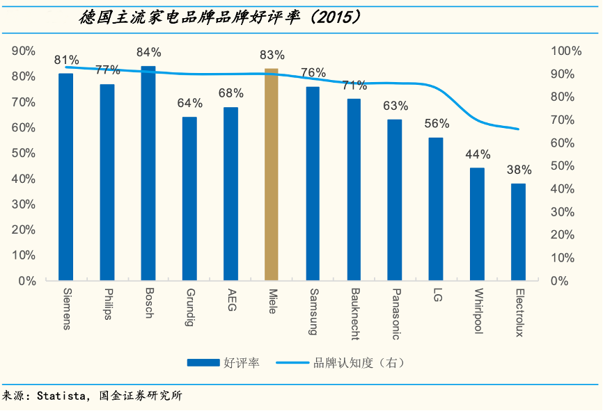 經(jīng)典案例:根據(jù)Statista、國金證券研究所等綜合資訊表明,Mile在產(chǎn)品力+售后優(yōu)勢下,復(fù)購率和滿意度高。根據(jù)Statista,2015年德國的主流家電品牌品牌好評率榜中,Miele以83%的好評率位居第二,優(yōu)勢明顯。