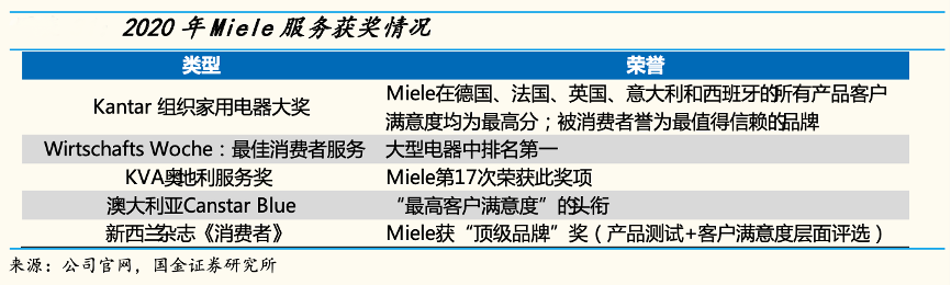 經(jīng)典案例:根據(jù)公司官網(wǎng)、國金證券研究所等綜合資訊表明,Miele 總共有約 2500 名售后服務(wù)人員,他們定期接受嚴(yán)格的培訓(xùn),并完成電話接聽和上門維系 等工作。其對員工有“首次呼叫完成率”(首次服務(wù)呼叫后完成的服務(wù)請求的百分比) 的嚴(yán)格要求,公司德國區(qū)首次呼叫完成率為 90%,高于行業(yè)平均水平。其每年都獲得個質(zhì)量和服務(wù)獎項。