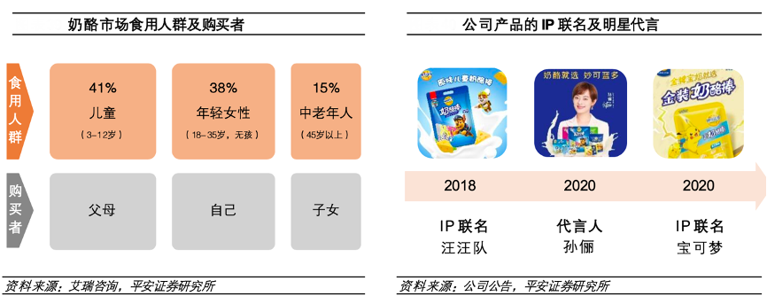經(jīng)典案例:根據(jù)艾瑞咨詢、公司公告、平安證券研究所等綜合資訊表明,2018年,妙可藍(lán)多公司與知名動(dòng)漫 IP “汪汪隊(duì)”進(jìn)行聯(lián)名合作,主要看中“汪汪隊(duì)”在兒童群體中的高熱度;2020 年,公司聘請(qǐng)孫儷為品牌代言人,主要瞄準(zhǔn)寶媽群體,同時(shí)攜手精靈寶可夢這一在 80、90 后心中極具份量的IP,推出金裝奶酪棒。