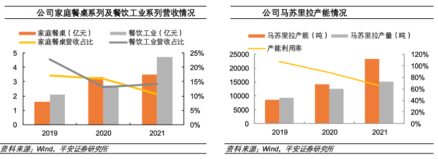 其提出“餐飲進(jìn)中餐”,從年輕一代入手培養(yǎng)國人的奶酪消費(fèi)習(xí)慣。經(jīng)過2021 年的產(chǎn)能擴(kuò)張,目前公司馬蘇里拉奶酪的產(chǎn)能基本充足,產(chǎn)能利用率為65.41%,為公司推動“餐飲進(jìn)中餐”提供了產(chǎn)能保證。