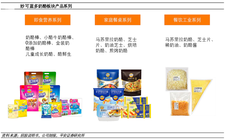 經(jīng)典案例:根據(jù)招股說明書、公司財報、平安證券研究所等綜合資訊表明,妙可藍(lán)多奶酪板塊主要分為三條產(chǎn)品系列:即食營養(yǎng)系列2021年?duì)I收占比高達(dá)75.37%,2018年推出核心產(chǎn)品低溫奶酪棒后,公司持續(xù)對產(chǎn)品進(jìn)行迭代升級,2021年推出常溫奶酪棒,同年奶酪棒產(chǎn)量占比提升至 56%;而餐飲工業(yè)系列營收占比 14.09%,其在保持大包裝馬蘇里拉奶酪領(lǐng)先位置的同時,不斷拓展西餐、烘焙、茶飲、工業(yè)及中餐渠道。