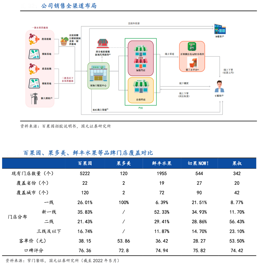 經(jīng)典案例:根據(jù)百果園招股說明書、窄門餐眼、國(guó)元證券研究所等綜合資訊說明,目前百果園公司旗下主要有百果園和果多美兩大渠道品牌。“百果園”為公司自創(chuàng)品牌,面向中高端市場(chǎng)消費(fèi)者提供高品質(zhì)果品;果多美則是2017 年底收購(gòu)所得的區(qū)域性渠道品牌。根據(jù)窄門餐眼 APP 數(shù)據(jù),截至 2022 年 5 月,百果園品牌下共有 5222 家門店,覆蓋全國(guó) 120 個(gè)城市,一線城市占比26.01%、新一線城市占比 35.83%。