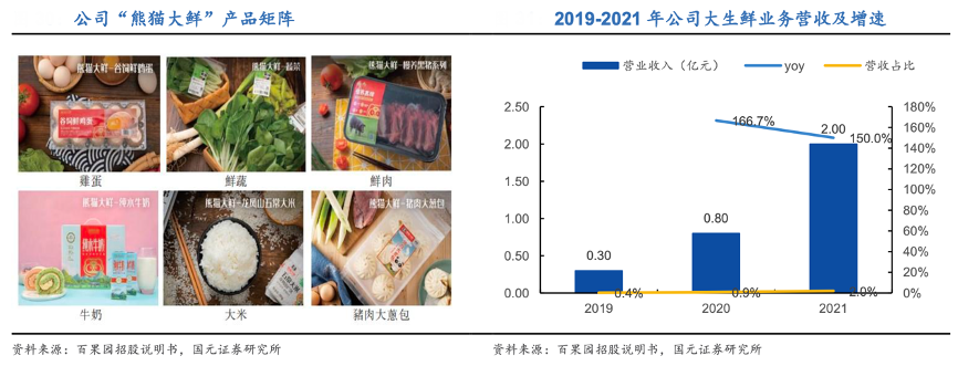 經(jīng)典案例:根據(jù)百果園招股說明書、國(guó)元證券研究所等綜合資訊說明,百果園公司近年來橫向拓展 SKU,將水果零售的成功經(jīng)驗(yàn)復(fù)制至“大生鮮”板塊。2020年底公司推出生鮮自有品牌“熊貓大鮮”,主要分銷包括非標(biāo)品的產(chǎn)品蔬菜、鮮肉、海鮮等,以及預(yù)包裝的標(biāo)品如糧油、乳制品等,截至 202 1 年底品牌業(yè)務(wù)覆蓋超 100 種大生鮮品類。2021年公司大生鮮業(yè)務(wù)營(yíng)收為 2 億元,同比增長(zhǎng) 150.0%,占產(chǎn)品銷售總收入比重由 2019 年的 0.4%提升至2.0%。