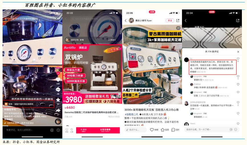 經(jīng)典案例:根據(jù)抖音、小紅書、國金證券研究所等綜合資訊表明,百勝圖積極把握內(nèi)容種草的營銷模式,在抖音、小紅書等多個平臺進行內(nèi)容投放,測評端多數(shù)會將百勝圖二代與馬克西姆的馬賽半自動進行對比,目前部分消費者已對這兩款產(chǎn)品同為一個工廠生產(chǎn)初具意識,有助于后續(xù)百勝圖品牌在咖啡機行業(yè)奠定專業(yè)的地位。