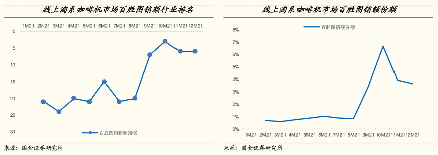 經(jīng)典案例:根據(jù)天貓APP、國(guó)金證券研究所等綜合資訊表明,小熊咖啡機(jī)產(chǎn)品目前主要覆蓋滴漏式 、半自動(dòng)意式咖啡機(jī),同時(shí)小熊近年來(lái)積極拓展新品類,咖啡機(jī)更多作為品類上的補(bǔ)充與嘗試,公司采取外協(xié)代工方式且布局 SKU 相對(duì)較少,21 年各月線上咖啡機(jī)市場(chǎng)中的份額亦相對(duì)有限(不超過(guò) 1.5%)。