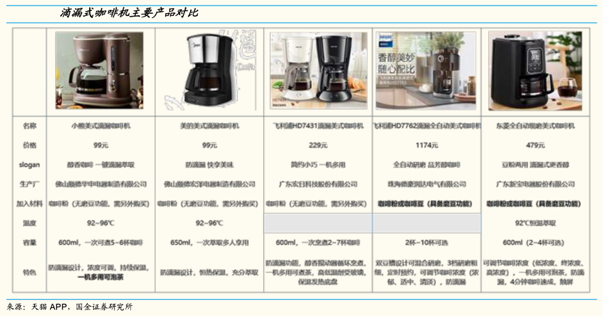 經(jīng)典案例:根據(jù)國(guó)金證券研究所等綜合資訊表明,滴漏式咖啡機(jī)的技術(shù)門檻相對(duì)較低,行業(yè)內(nèi)均價(jià)基本在百元左右,國(guó)產(chǎn)品牌以高顏值和性價(jià)比獲得一定的領(lǐng)先地位。根據(jù) 3 月 9 日天貓咖啡機(jī)好評(píng)榜單來(lái)看,小熊品牌滴漏式咖啡機(jī)以高性價(jià)比(99 元)和一機(jī)多用等特色獲得消費(fèi)者青睞,位居榜單前列。