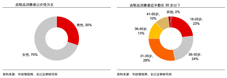 經(jīng)典案例:根據(jù)華經(jīng)情報(bào)網(wǎng)、長江證券研究所等綜合資訊表明,由于休閑鹵制品零食化的屬性,消費(fèi)者普遍偏年輕化。結(jié)合華經(jīng)情報(bào)網(wǎng)的數(shù)據(jù),鹵制品消費(fèi)以年輕女性為主,年齡在18-30 歲的消費(fèi)者占比接近一半。為契合年輕群體“宅經(jīng)濟(jì)”、“一人經(jīng)濟(jì)”、“夜宵經(jīng)濟(jì)”等需求,鹵味品牌開啟了消費(fèi)升級新體驗(yàn)。
