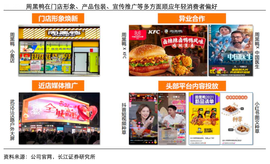 經(jīng)典案例:根據(jù)公司官網(wǎng)、長江證券研究所等綜合資訊表明,周黑鴨新形象門店“小黃店”全國落地,以新潮、時尚的品牌調(diào)性引領(lǐng)年 輕消費(fèi)者,加速推動品牌年輕化。尤其是在在營銷方面,其進(jìn)一步整合全渠道媒體資源,充分利用各類社交媒體、長短視頻、直播平臺等資源,加大廣告投放力度的同時提升各平臺上投放內(nèi)容的廣度與深度;同時,積極開展近店媒體推廣,加強(qiáng)線下門店區(qū)域內(nèi)廣告投放力度、強(qiáng)化門店展示和試吃、開展各類促銷活動,加大店面曝光。
