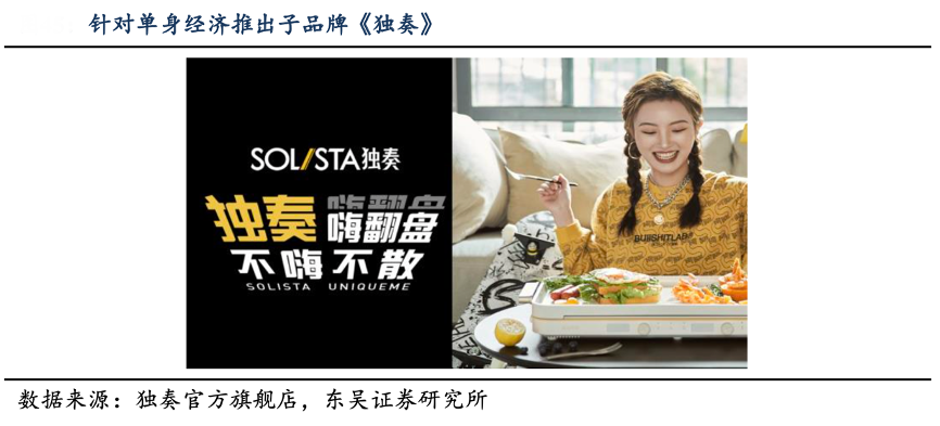 經(jīng)典案例:根據(jù)艾媒數(shù)據(jù)中心、獨(dú)奏官方旗艦店、東吳證券研究所等綜合資訊表明,九陽(yáng)針對(duì)年輕單身用戶打造《獨(dú)奏》子品牌搶占單身人群的新興市場(chǎng),“致力于為當(dāng)代年輕人提供全套生活解決方案”。