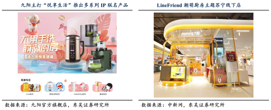 經(jīng)典案例:根據(jù)九陽(yáng)官方旗艦店、中新網(wǎng)、東吳證券研究所等綜合資訊表明,為進(jìn)一步抓住趨勢(shì)順應(yīng)年輕化消費(fèi)群體崛起趨勢(shì),九陽(yáng)與潮萌品牌進(jìn)行跨界 IP 合作,推出以LineFriends為代表的潮萌小家電,打造“高顏值”產(chǎn)品,滿足千禧一代消費(fèi)群體為代表的新需求,建立文化認(rèn)同與品牌共鳴。