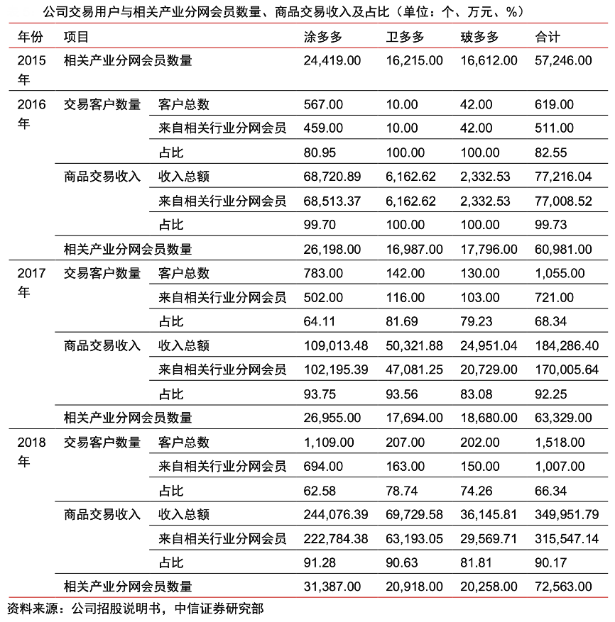 經典案例:根據(jù)公司招股說明書、中信證券研究部等綜合資訊表明,國聯(lián)資源網歷經十余年的發(fā)展,在垂直產業(yè)鏈積累了深厚的行業(yè)認知和上下游資源,錘煉了有深刻行業(yè)理解的團隊;多多電商受益于國聯(lián)資源網的用戶的有效轉化。在涂多多、衛(wèi)多多、玻多多發(fā)展初期,80%以上的客戶來自國聯(lián)資源網相關分網,且這部分客戶的購買力更強,交易額高于平均水平。